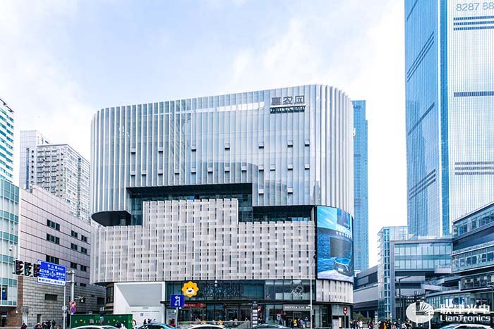 项目采用联建光电高端节能户外屏FS6,面积为138㎡,超高的户外分辨率,8000:1的对比度,是目前五一商圈内最为高清的户外LED显示屏;1:1比例的四分之一圆弧设计别具一格,为建筑打开一个生动灵巧的窗口。