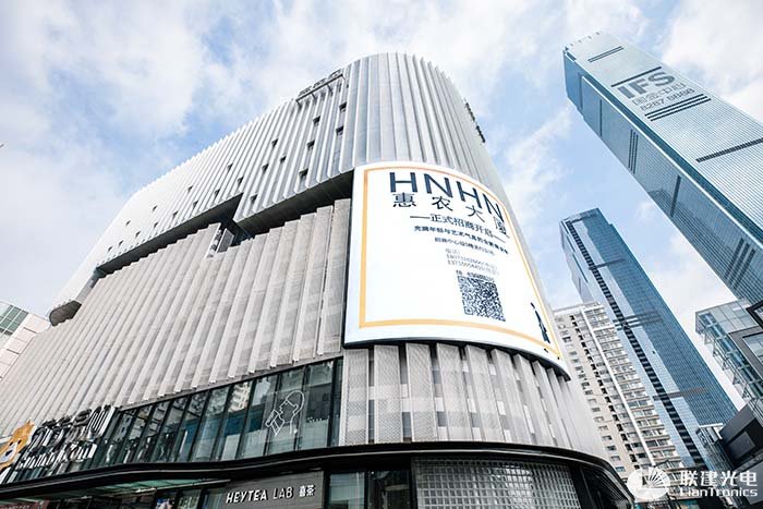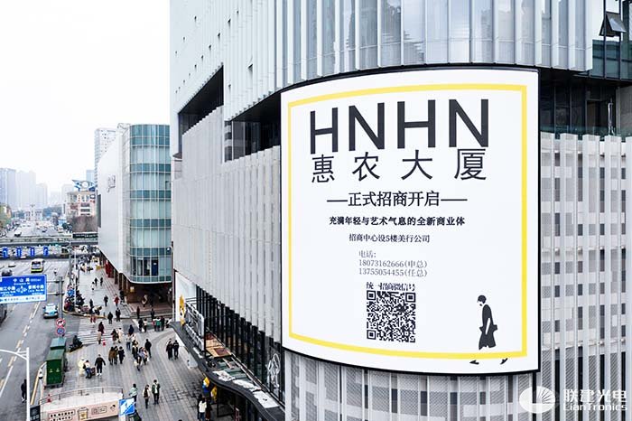 该项目安装地点惠农大厦,地处长沙五一商圈的核心位置,日人流量高达10万人次,艺术和商业完美结合的惠农大厦与国金中心临街相望,是长沙旅游的“网红”打卡地之一;大楼周围消费人群具有收入高、年轻化、高学历等特质,购物欲望大,购买力强,加之弧形的视觉设计,最大程度覆盖核心受众,可获取“超顶级流量”。如此优越的商业位置,加上联建光电LED大屏独特的造型与完美的显示效果,吸睛能力倍升。目前已有湖南省第一家喜茶、蔚来汽车、7-11等知名品牌成功进驻,其媒体商业价值不可估量。