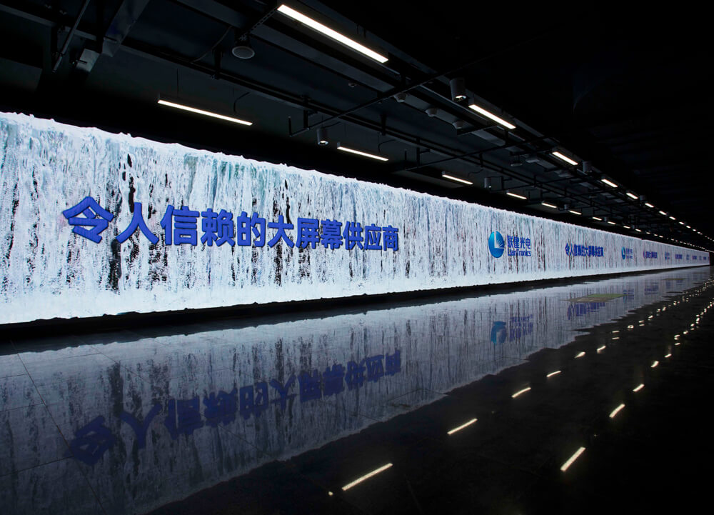在连接14号线与2号线,人流量巨大的陆家嘴站换乘通道内,联建光电为其打造了一套全长超过112米的巨型LED小间距屏,面积达300㎡。屏幕分辨率高达44928×1056,并应用了联建光电专利智能喷墨技术,在保证整屏墨色一致性的同时提高对比度,屏幕亮度可根据时段的不同进行调节,带来极佳画质。