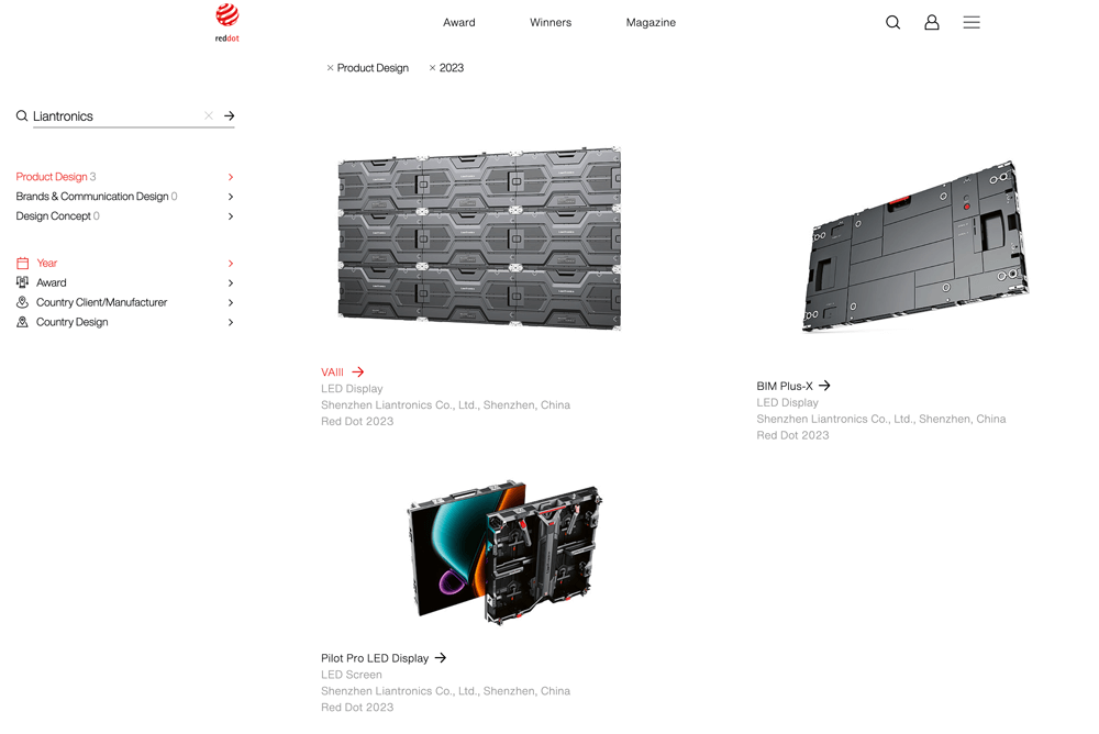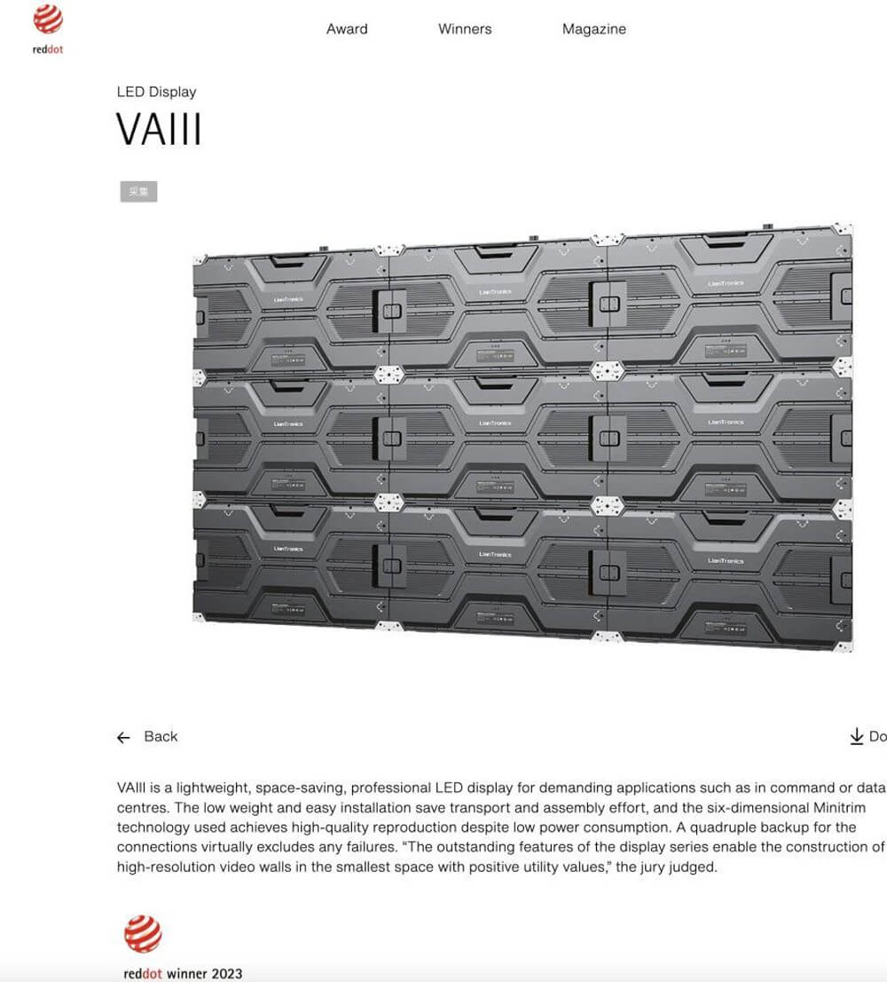 近日,2023年德国红点设计大奖名单公布。联建光电VAIII系列微间距显示屏、Pilot Pro系列租赁显示屏、BIM Plus-X系列室内商业显示屏三款产品同时斩获素有设计界“奥斯卡”之称的红点设计奖,这三款产品凝聚着全球前沿技术和创新设计,实至名归。据统计,联建光电是2023红点奖中获奖最多的LED显示品牌。