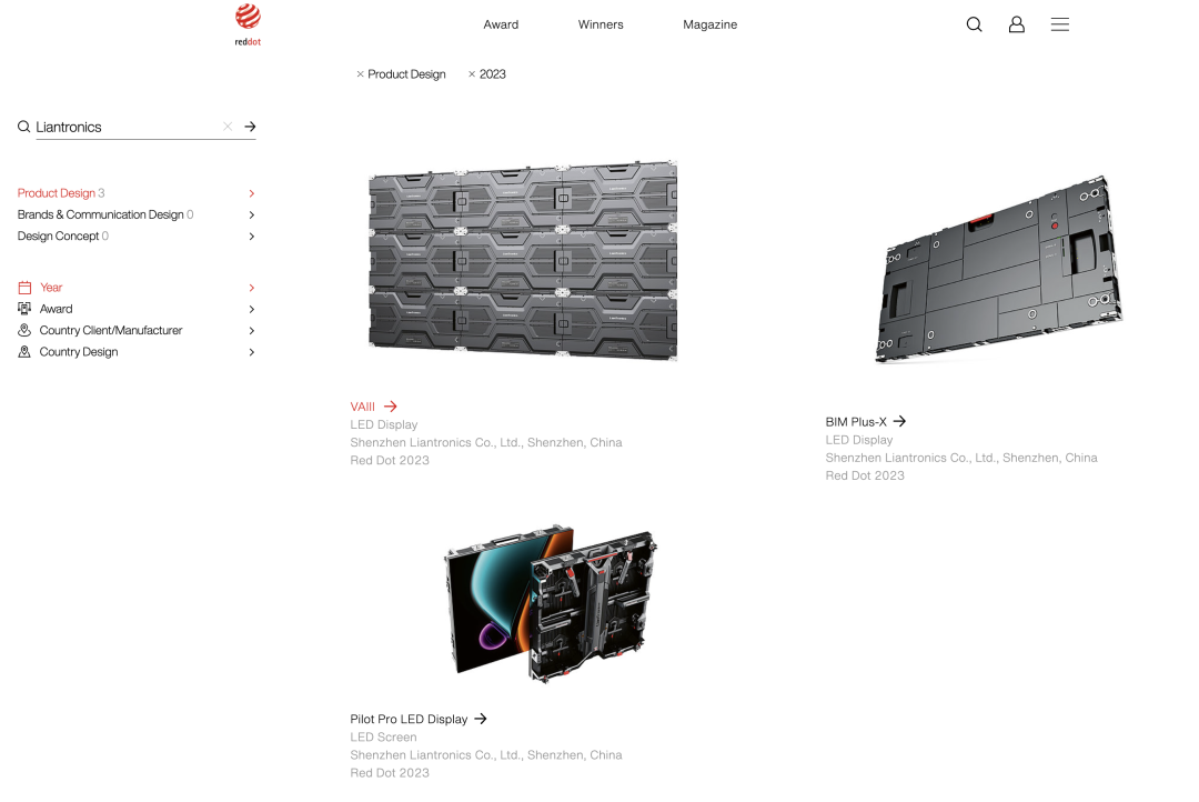 荣获国际设计界“奥斯卡”奖,实至名归。6月19日,2023年德国红点设计大奖名单公布。联建光电VAIII系列微间距显示屏、Pilot Pro系列租赁显示屏、BIM Plus-X系列室内商业显示屏三款产品同时斩获素有设计界“奥斯卡”之称的红点设计奖。据统计,联建光电也是2023红点奖中获奖最多的LED显示品牌。