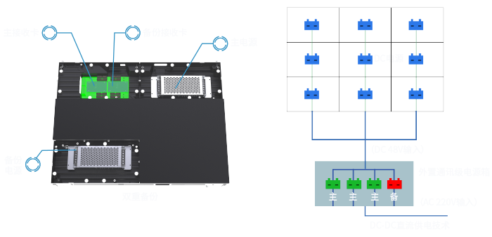 可选电源、接收卡双备份,供电、信号传输稳定,持续运行不黑屏