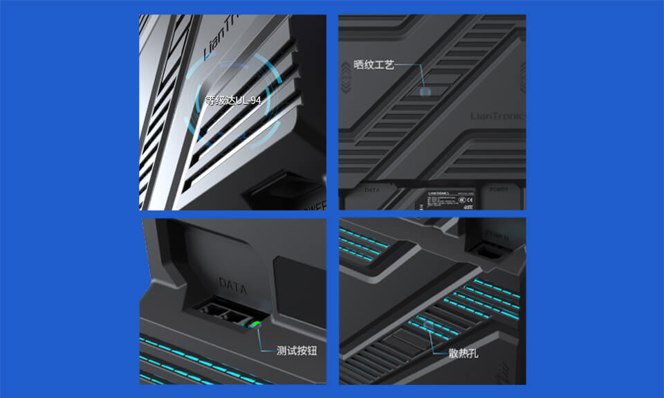 阻燃等级达到UL-94 ,有效防火阻燃;后盖晒纹工艺,质感出众
